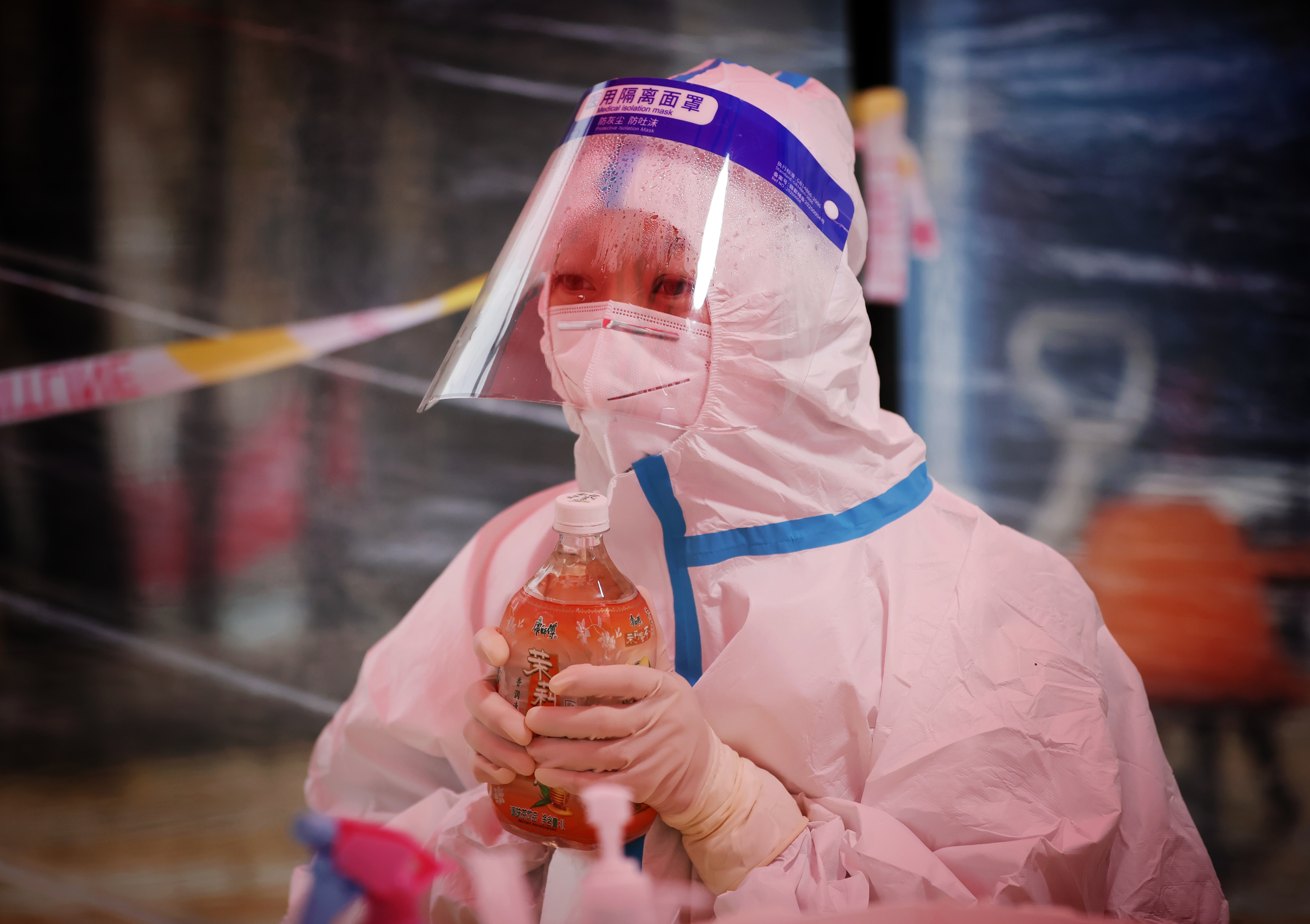 哈爾濱市第一人民醫(yī)院的醫(yī)護(hù)人員在核酸檢測取樣